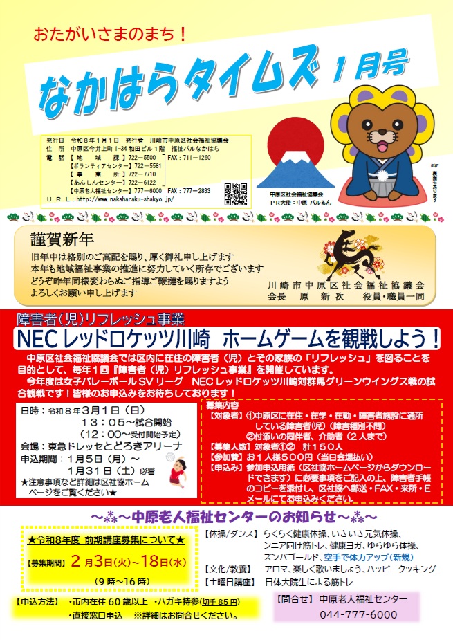 今号では、新年のご挨拶をはじめ、障害者(児)リフレッシュ事業「NECレッドロケッツ川崎 ホームゲーム観戦」のご案内や、中原老人福祉センターの令和8年度前期講座募集ほか、暮らしに役立つ情報を掲載しています。