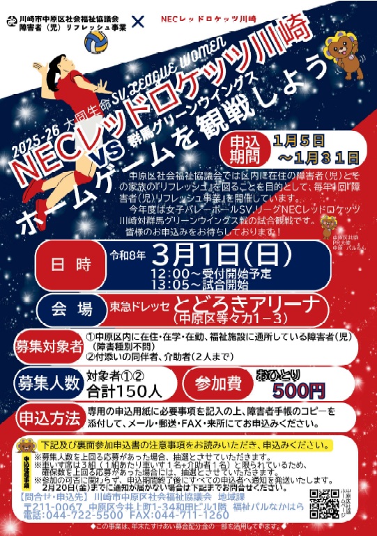 中原区社協では区内に在住の障害者(児)とその家族のリフレッシュを図ることを目的として、毎年1回『障害者(児)リフレッシュ事業』を開催しています。 今年度は女子バレーボールSV.リーグ NECレッドロケッツ川崎対群馬グリーンウイングス戦の試合観戦です。