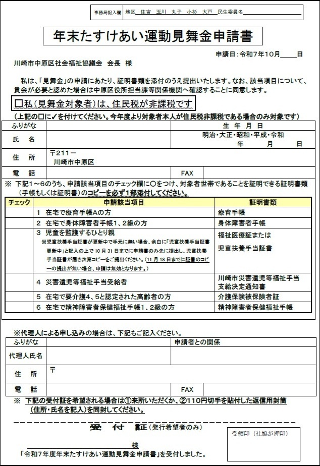 中原区社会福祉協議会では、共同募金運動の一環として実施される年末たすけあい募金を財源に、地域の方へ見舞金を配付する事業をおこなっています。
