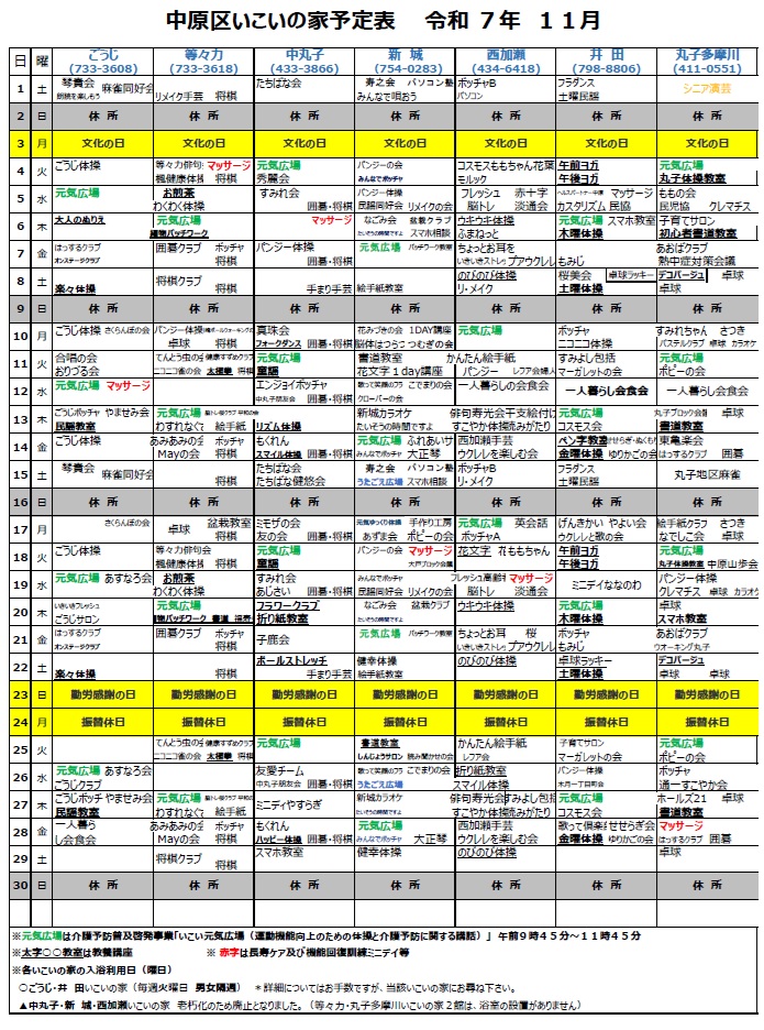 中原区内いこいの家予定表です。1か月ごとに更新します。