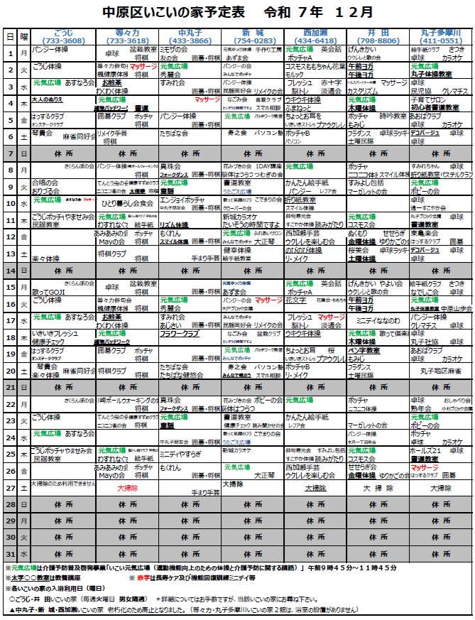 中原区内いこいの家 12月予定表