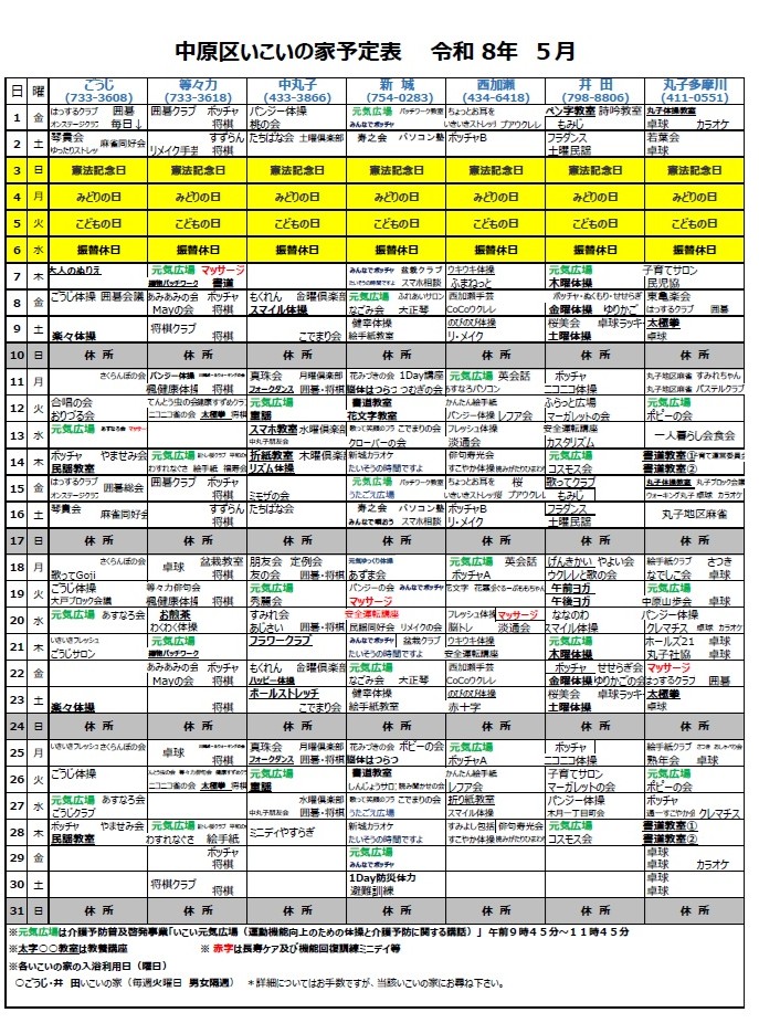 中原区内いこいの家 5月予定表