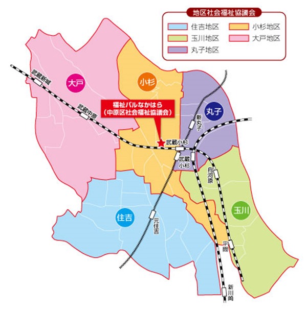 中原区内には5つの「地区社会福祉協議会」があります。構成員や活動内容は、それぞれの「地区社会福祉協議会」によって異なりますが、その多くは町内会・自治会、民生委員児童委員、保護司、社会福祉に関する団体等によって構成され 、様々な福祉活動が行われています。