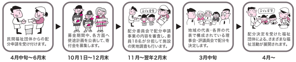 募金は、毎年4月から7月に県内の民間社会福祉施設・団体等から受配要望を受け付け県共同募金会の配分委員会によって確認・調整し、共同募金運動終了後、県共同募金会の理事会・評議会で決定され、翌年度に交付されます。