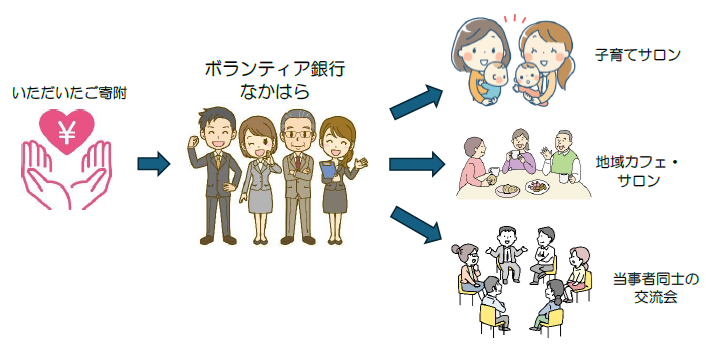 中原区社会福祉協議会では、地域福祉活動を行うボランティアグループ及び福祉団体の自主的な活動を支援する助成金事業(ボランティア銀行なかはら)の財源として、皆様からの温かいご寄附をお願いしております。