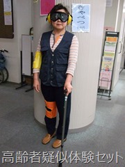 動きを制限する装具や視野を狭くする眼鏡をかけて80歳くらいになったときの身体の動きを体験できるセットを貸し出しています。
